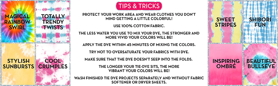 Step By Step Instructions from Folding to Washing has. According to the Jacquard Tie-Dye Kit reviews each kit contains three applicator bottles with dye rubber bands gloves dye fixer and instructions for different patterns. Similar item to consider Desire Deluxe Tie Dye Kit Set of 9 Paint Colours Ink for Dyeing Fabric Clothes Creative Art Craft Tie-Dye Kits Games Activity for Adults Kids 2106.
